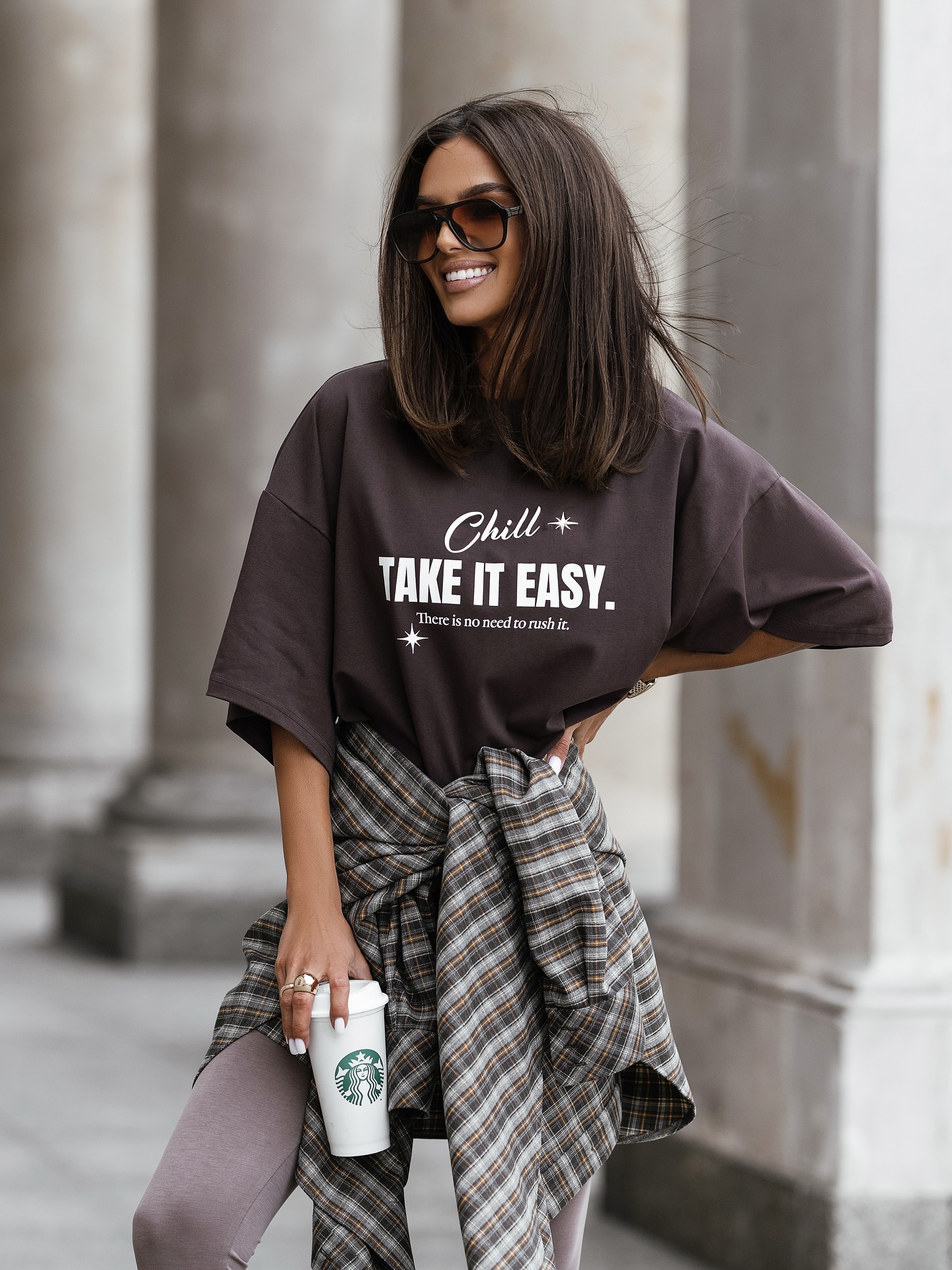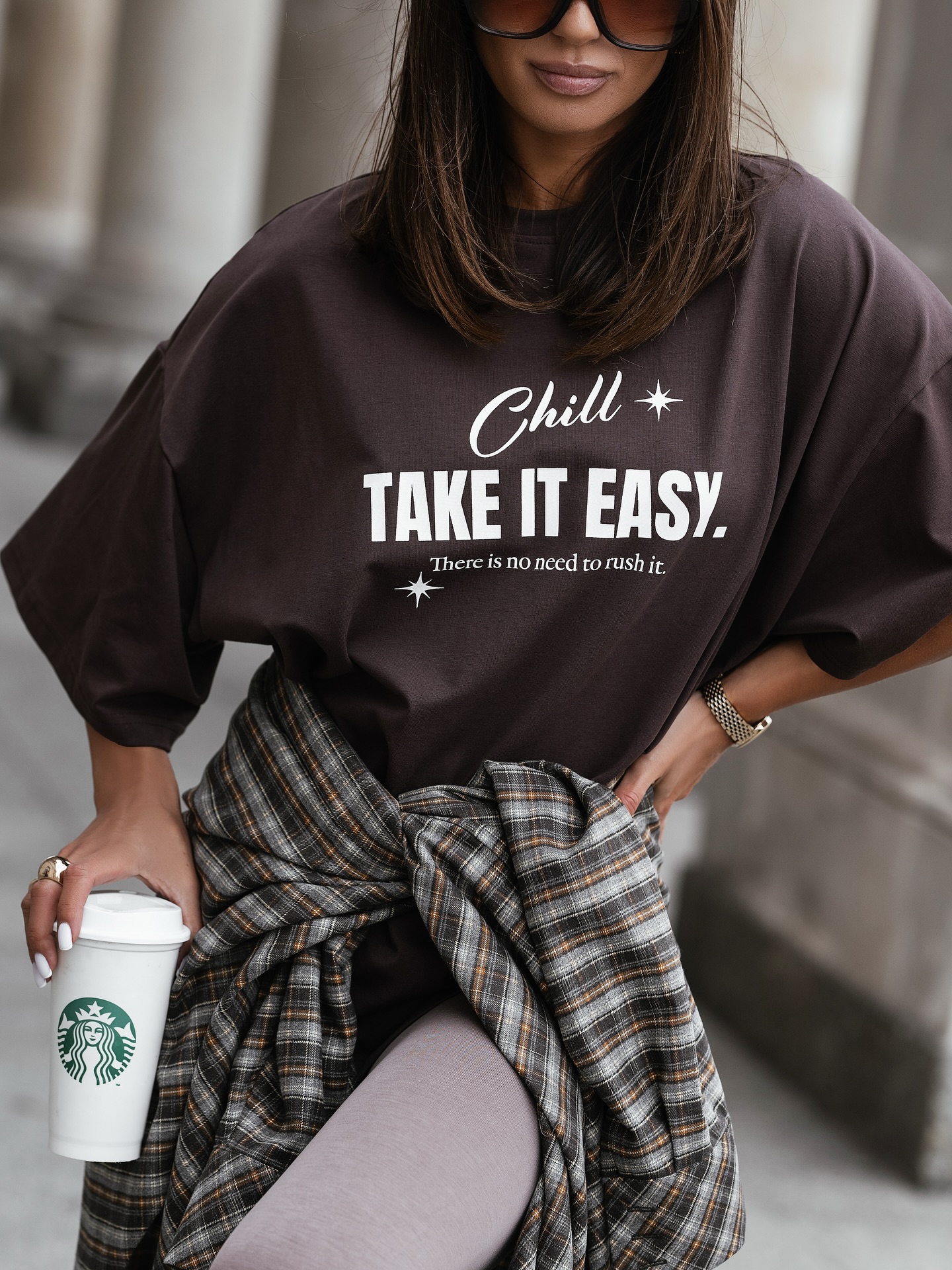 Patogūs oversize marškinėliai su stilingu užrašu CHILL TAKE IT EASY – puikus pasirinkimas kasdienai.