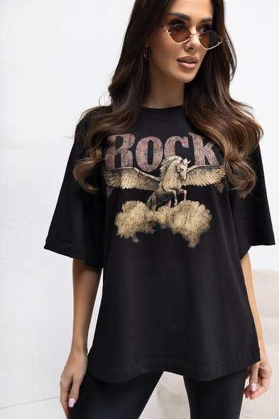 Vintažinio rock stiliaus grafika su galingai sparnais plasnojančiu Pegasu ir užrašu „ROCK” pavers bet kokį kasdienį įvaizdį į ryškų stiliaus akcentą.